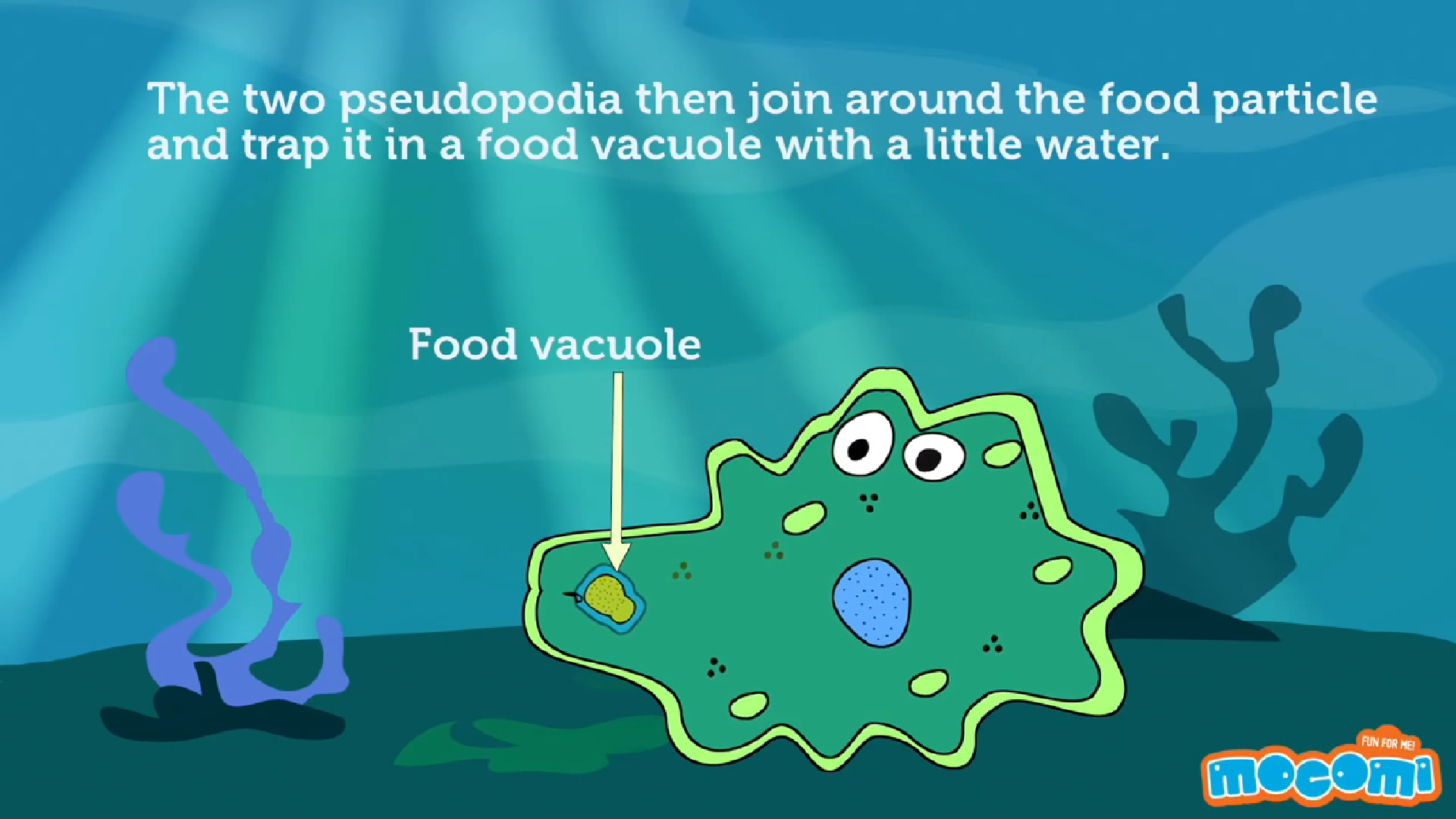 Ans: Amoeba feeds on tiny plants animals present in pond water where it lives .